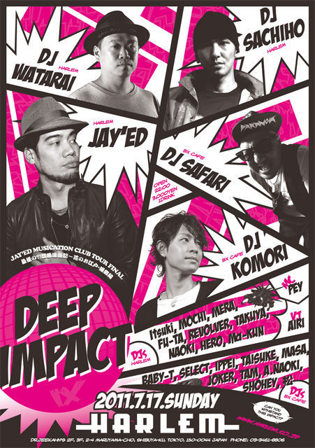 管理人様、告知失礼します! GOLDEN WEEKの衝撃も覚めやらぬまま、DEEP IMPACTが7/17に開催されます! フロアを盛り上げるのはWATARAI、SAFARI、KOMORI、SACHIHOと文句なしのラインナップ! 今回の目玉は、今やシンガーとして超メジャー級のJAY'EDがDEEP IMPACT初登場!!その日限りのステージでオーディエンスを釘付けにすることでしょう! 今回も皆さんに衝撃をお届けすることを約束します!! ★☆★☆★☆★☆★☆★☆★☆★☆★☆★☆★☆★☆★☆★☆★☆★☆★☆★☆★☆ この豪華なイベントに自分にメッセージ頂ければ、 3000/1Dの所