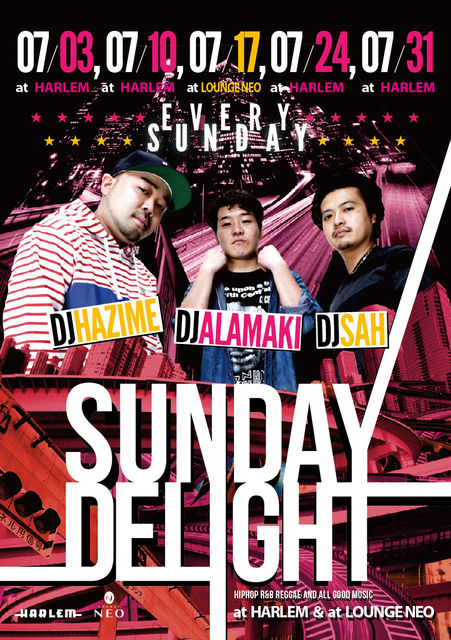 ブエノス初の帯イベントとして2010年産声をあげたSUNDAY DELIGHT。 初回から驚異的な盛り上がりを見せ、既に数多くの"サンデラ"ファンが存在、その数は回を重ねる毎に増加する一方。今回はSUNDAY DELIGHT祝前SP メインを務めるDJはこの3人…圧倒的な存在感とスキルでフロアを120盛り上げる『DJ HAZIME』。 黒い選曲をモットーに各方面で活躍中の『DJ SAH』。 誰にも真似する事の出来ない独自の感性でジャンルの垣根を越える『DJ ALAMKI』。 この3人がケムに巻くフロアに