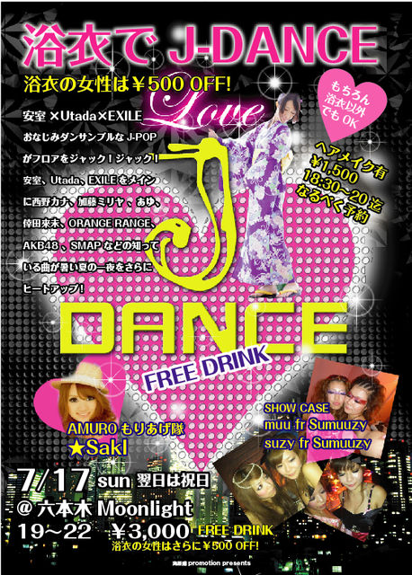 7.17sun JPOP×浴衣☆安室・EXILE...etc..Jで踊ろう六本木♪ヘアメイクブースで自分を演出して、FREE DRINKではっちゃけ!そのあともまだたっぷり夜は続く♪ ☆浴衣でご来場の女性は500円OFF (浴衣でなくてもOKです/ディスカウントは浴衣の方のみ) ☆18:30〜20:00の間はヘアメイクブース有 (イベントは19〜22です) プロのヘアメイクが今夜のあなたを演出! (なるべく前日迄にご予約下さい。先着順になります) ☆六本木でJ-POPがフロアをジャック ☆お財布にやさしすぎるFREE DRINK ☆ソフ