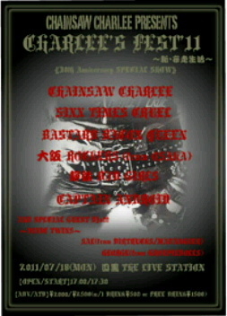 2011/07/18(MON) CHAINSAW CHARLEE PRESENTS 『CHARLEE'S FEST '11』〜新・妄走生活〜 《30th Anniversary SPECIAL SHOW》 目黒 THE LIVE STATION http://www.livestation.co.jp 【OPEN/START】17:00/17:30 【ADV/ATD】\2000/\2500(w/1 DRINK \500 or FREE DRINK \1500) ※中学生以下無料(保護者同伴が必要です&ドリンク代が別途かかります。) -CAST- CHAINSAW CHARLEE SIXX TIMES CRUEL BASTARD BACON QUEEN 大阪ROCKERS 静鉄B∀D GIRLS CAPTAIN ANDROID AND SPECIAL GUEST DJs