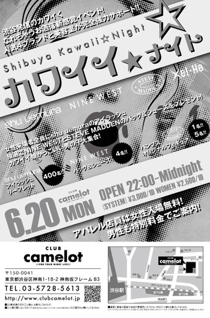 6/20★ゲスト入場★女子の為の豪華コンテンツご用意♪ 告知失礼致します。 管理者様、内容が不適切でしたらお手数ですがご指摘、削除お願いします。 6月20日(月曜)の渋谷camelotのPARTY情報です 『女の子は常に可愛くいたい もっともっと可愛くなりたい』 そんなあなたに取って置きのイベントを開催します 渋谷発信のカワイクなれちゃうオシャレ新感覚イベント 人気4ブランドと美容室が完全強力サポート スペシャルプレゼントをご用意 女性来場者全員にshu uemuraのアイラッシュ