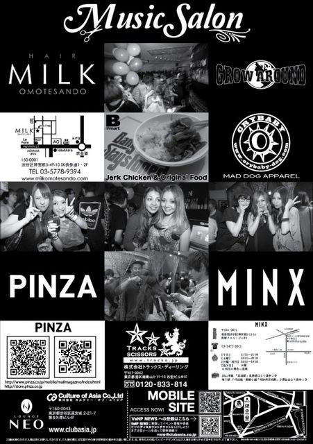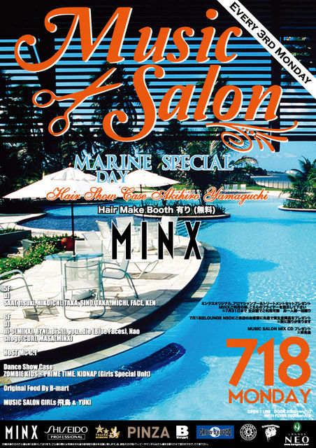 管理人様告知失礼します。 毎回美容師やアパレル関係やお洒落さんで300人規模で賑わう、 毎月第3月曜日渋谷LOUNGE NEOで開催される『MUSIC SALON』!! 今回7/18は海の日ということで『MARIN DAY SPECIAL』!! 先着で資生堂よりプレゼント有り! 又今回はヘアショーに加え、PRIMETIME&ZOMBIKIDSによるダンスショーケースまで! 豪華な内容でお届けするMUSIC SALONへ是非足をお運びください♪ ※尚、こちらのイベントのフライヤーをMINXに持参して頂ければ、 MINXオリジナルアロマシャンプー、トリートメントをプレゼント! −