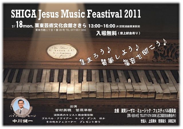 集まろう、賛美しよう、福音を聞こう バイブルメッセージ 中川健一 出演 吉村美穂・菅原早樹 滋賀県内キリスト教会聖歌隊 ゴスペル・クワイアー、キッズ・ダンス その他、カフェコーナー、プレゼントあり。
