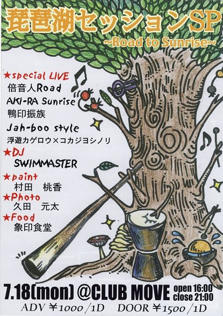 琵琶湖セッションSP 〜Road to Sunrise〜 滋賀県、琵琶湖ーーその畔に集まる音好き達。彼らが始めた民族楽器の集い、それが琵琶湖セッション。 夜な夜な奏でられる音の波紋に吸い寄せられるように琵琶湖セッションは回を重ねるごとにそのメンバーを増やし今回MOVEにやって来る!!『琵琶湖セッションSP』記念すべき第1回目は、〜Road to Sunrise〜と銘打ち、2人のスペシャルゲストを迎える。 ◆LIVEの合間にみんなでセッションタイムもあるよ!楽器持って遊びに来てね〜♪ ◆お昼12時からは膳所公園で無料セッションもやってマス! 7月