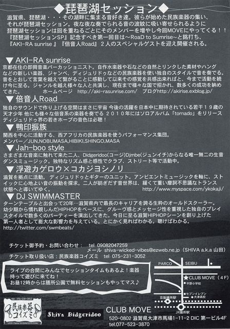 管理人様、告知失礼いたします。 琵琶湖セッションSP 〜Road to Sunrise〜 滋賀県、琵琶湖ーーその畔に集まる音好き達。彼らが始めた民族楽器の集い、それが琵琶湖セッション。 夜な夜な奏でられる音の波紋に吸い寄せられるように琵琶湖セッションは回を重ねるごとにそのメンバーを増やし今回MOVEにやって来る!!『琵琶湖セッションSP』記念すべき第1回目は、〜Road to Sunrise〜と銘打ち、2人のスペシャルゲストを迎える。 ◆LIVEの合間にみんなでセッションタイムもあるよ!楽器持って遊びに来てね〜♪ ◆お昼12時からは膳所公園で無料