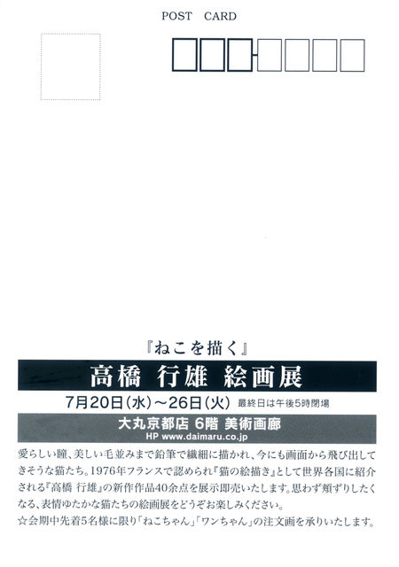◆7月13日〜19日:大丸神戸店:「猫の絵画展」出品 そして、次回の個展は・・・ **************************************** ねこを描く 高橋 行雄 絵画展 **************************************** ◆京都大丸6階 美術画廊 http://www.daimarukyoto.com/art/index.html ◆7月20日(水)→26日(火)