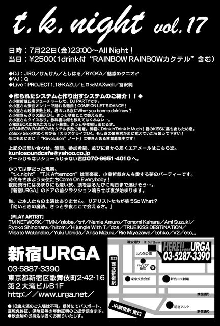 小室哲哉さん関連曲オンリーのひとときを週末の夜の新宿にて! “t.k.night”は、 小室哲哉さんの音楽を徹底的に振り返るDJ&Liveパーティーです。 あらゆる角度から体感出来る充実のひとときをご一緒出来る空間を実現致します。 お一人の方、イベント初心者の方も大歓迎ですよ。 ご質問やリクエストも遠慮なくコメント、メッセージ下さいね! “t.k.night vol.17” 日時:7/22(金)23:00〜All Night! 会場:新宿URGA 03-5887-3390 住所:新宿区歌舞伎町2-42-16第2大滝ビルB1F http://www.urga.net/ 当日:\2500(1dri