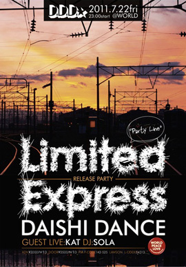 - Limited Express Release Party - そして、関西 DAISHI DANCE 部 設立1周年記念パーティー MAIN DJ:DAISHI DANCE GUEST LIVE:KAT LIGHTING&LASER:SOLA OPEN:22:00 - DEEPNIGHT DOOR:3500 yen with 1drink MENBER & ADVANCE:3000 yen with 1drink http://www.world-kyoto.com/schedule/2011/7/22.html 23時WORLD前集合です