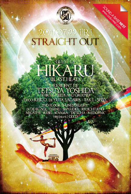 久々のS.O開催!ゲストはMr.フリー、究極のオールラウンドプレイヤー、DJ HIKARU!!!多くのパーティーフリークを虜にし続ける縦横無尽、唯一無二のプレイでロックされることマチガイナシ!!さらに今回は栃木のベースミュージック最狂パーティー”B.L.D”が2ndフロアーにてガッツリBASH!! 2011.07.22 Fri STARIGHT OUT @ SOUND A BASE NEST ☆Open22〜 ☆Charge:W/F 2500yen(1D) / Day 2500yen ★Guest DJ: HIKARU (Blast Head) ★Resident DJ: Tetsuya Yoshida ★Support DJs: Yuta Sagawa / Take / Spisy ★Deco: