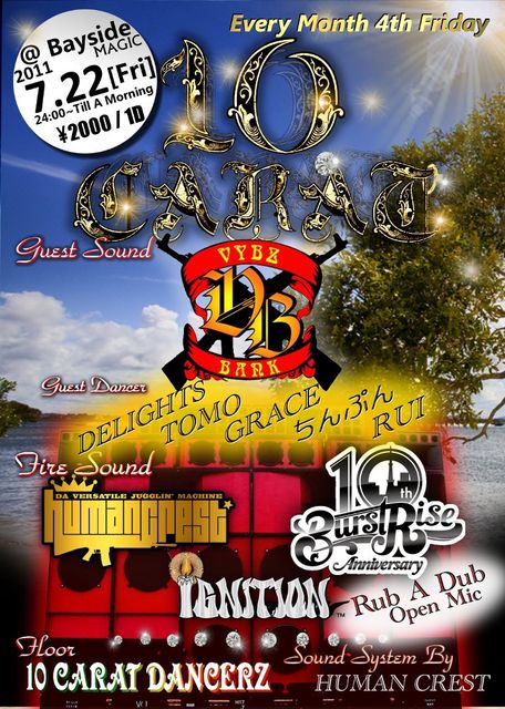 管理人様告知させて頂きます。 "10 CARAT " 7/22(金) @BAYSIDE MAGIC yokohama OPEN:24:00〜Till Morning ADM:¥2000/1D ■GUEST SOUND VYBZ BANK fr.SAITAMA ■HOST SOUND HUMAN CREST BURST RISE IGNITION ■10CARAT DANCERZ CISTUS MILKY SIZZKA SWAY BABY-S and more!!! ■SOUND SYSTEM HUMAN CREST ※ MUST CHECK ID!!! 2010年2月から始まった横浜の第4金曜のPARTY NIGHT!! 『10 CARAT』 HUMAN CRESTとBURST RISEが軸となって新旧問わず良質で上質な 音楽をお