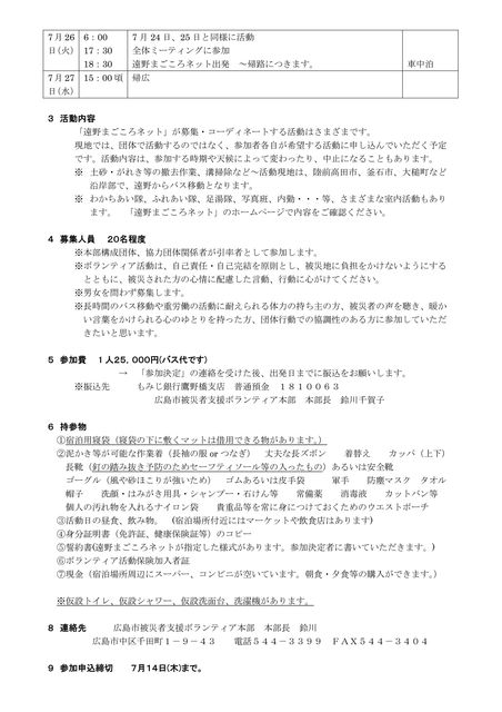 臨時募集 岩手県の被災地へ行くボランティア募集(7月22日出発) 活動日時 7月22日(金)夜9時出発〜7月27日(水)帰広 活動場所 岩手県遠野市「遠野まごころネット」、及び陸前高田市、釜石市、大槌町等の沿岸部 活動内容 沿岸部被災地でのがれき撤去、被災者への生活支援、ほか、「遠野まごころネット」が募集・コーディネートする活動。 募集対象者 ・長時間のバス移動(約19時間)や炎天下での作業に耐えられる方 ・自己責任・自己完結で責任ある行動のとれる方 ・被災された方の心情に配慮した言動のできる方 ・被災者支援ボ