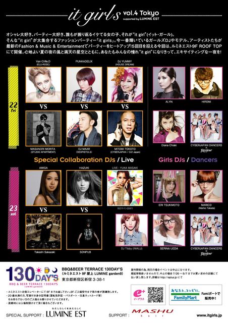 it girls vol.4 Tokyo supported by LUMINE EST SAVE THE SMILE!!! オシャレ大好き、パーティー大好き、誰もが振り返るイケてる女の子、 それが “ it girl “ (イット・ガール)。 そんな “ it girl “が大集合するファッションパーティー「 it girls 」。 今一番輝いているガールズDJやモデル、アーティストたちが 最新のFashion & Music & Entertainmentでパーティーをヒートアップ! 5回目を迎える今回は、ルミネエスト9F ROOF TOPにて開催。 心地よい夏の夜の風と満天の星空とともに、 あなたもみんなの憧れ “ it girl “ になりき