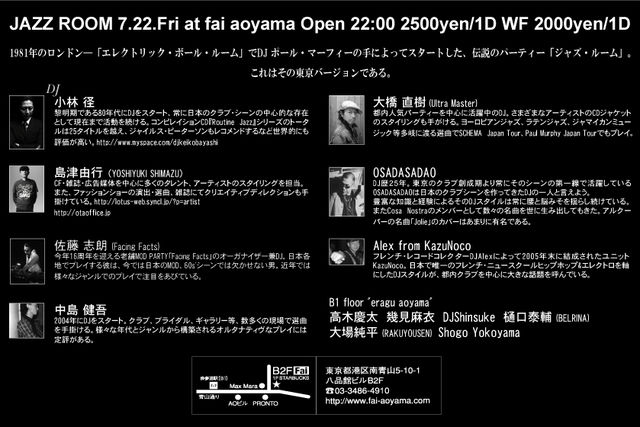 管理人様、告知失礼致します。 『JAZZROOM』 1981年のロンドン──「エレクトリック・ボール・ルーム」でDJポール・マーフィーの手によってスタートした伝説のパーティー、「ジャズ・ルーム」。 これはその東京バージョンである。 2011.7.22(fri)@fai aoyama ¥2500(1drink) WITH FLYER ¥2000(1drink) start 22:00 to 5:00 http://www.fai-aoyama.com/ DJ 小林径 大橋直樹(Ultra Master) 島津由行(YOSHIYUKI SHIMAZU) OSADASADAO Alex from KazuNoco 佐藤志朗(Facing Facts) 中島健吾 LOUNGE FLOOR