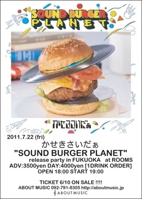 2011.7.22 (fri) かせきさいだぁ "SOUND BURGER PLANET" release party in FUKUOKA at ROOMS ADV:3500yen DAY:4000yen [1DRINK ORDER] OPEN 18:00 START 19:00 LIVE かせきさいだ アナ DJs KAZUO EDANI TICKET LAWSON L-88985 ちけっとぴあ141-634 TICRO MARKET 092 725-5424 INFOMATION ABOUT MUSIC 092-791-8305 http://aboutmusic.jp