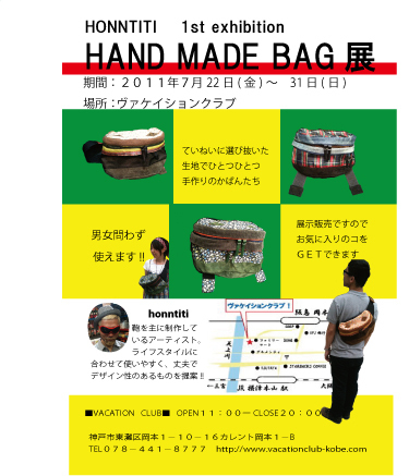 みなさんーなつ楽しんでますかー? お陰様で!!無事帽子てんも終わりましたー!! 皆様本当にありがとうございました★★ 展示終わっちゃったなぁぁ寂しいなぁ… なぁんて言ってられません!! なんたって今月の30日で5才迎えますもの♪ ガンガンいきますよー!!! というわけで、春以来の作家さん展示やります!! その名も「honntiti 1st exhibition」 かばんアーティストのhonntitiさんのハジメマシテ個展です♪ 見た目はcolorも素材も個性的で布同士の合わせ方がステキなんです♪ そう、まさに一