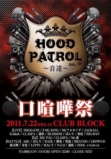 管理人様、告知失礼します。 ■HOOD PATROL〜音達〜vol.12■  第8回 口喧嘩祭 開催!! 【ラッパー16人によるトーナメント式のフリースタイルMCバトル!!詳細はコミュニティーにて…】 ▼日時・場所・チケット▼ 2011.7.22(FRI) OPEN 22:00〜 CLOSE 〜MID 岐阜@CLUB BLOCK 岐阜県岐阜市柳ケ瀬通1-7三越ビル3F チケット 1,000yen(ADM) INFO sunflagbang@yahoo.co.jp ▼CAST▼ <LIVE> HIKIGANE/2 MC KING/MCアルカイダ JACKALL/K-2daK/CLASPA 蓮臥/BLOSSOM/ばんり 泰弦/BIG-BAN <DJ> BIG PAC/CLASPA/M