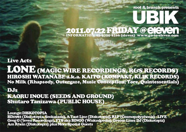 2011.7.22 FRI root & branch presents UBIK at eleven http://go-to-eleven.com/ OPEN 22:00 \3000 \2500(with flyer) Live: LONE(Magic Wire Recordings/R&S Records, UK) Hiroshi Watanabe a.k.a Kaito DJ: Kaoru Inoue(seeds and ground) and more LONE(Magic Wire Recordings, R&S Records-UK) 孤独(LONELY)または一匹狼(LONER)を由来とするアーティスト・ネーム"LONE"を名乗る男MATT CUTLERは、イギリス中部ノッティンガム出身の今最も注目すべきアーティストの一人。BOARDS OF CANADA、MADLIB、APHEX TWIN、WU