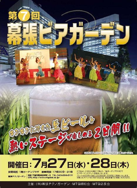 第7回幕張ビアガーデン こんばんは、ミッキー吉川です。 さて、毎年MTG、いわゆる幕張テクノガーデンで催されているビアガーデンイベントに 今年も出演依頼を頂戴いたしました 今年もナディア先生を筆頭に、生徒みんなで踊っちゃいます 日時:7月27日(水)&28日(木) 17:30〜21:00 場所:幕張テクノガーデン 1階ガーデンプラザ 千葉市美浜区中瀬1-3 043-496-8131 http://www.mtg-bld.co.jp/ 最寄り駅は『海浜幕張駅』になります 尚、ビアガーデ