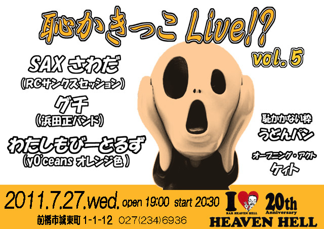 open pm7:00 start pm8:30 〜 出演 〜 ♪ グチ(浜田正バンド) ♪ わたしもびーとるず(yO'ceans オレンジ色) ♪ SAXさわだ(RCサンクスセッション) 〜恥かかない枠〜 ♪ うどんパン 〜Opening Act〜 ♪ ケィト 〜〆〜 ♪ マスター仁