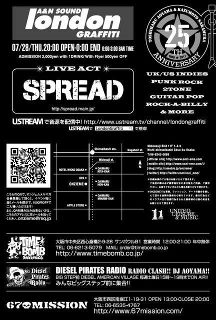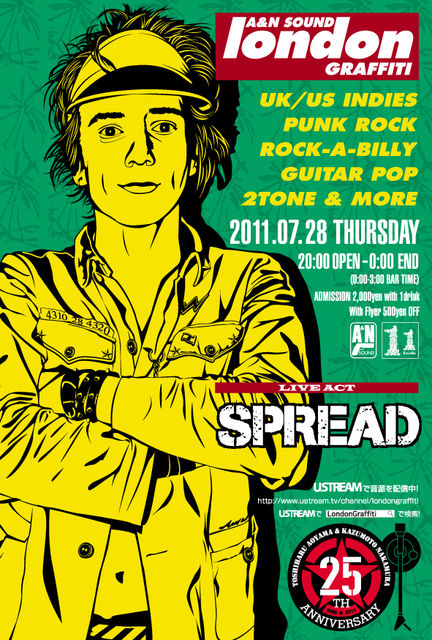 Live:SPREAD ACT:TOSHIHARU AOYAMA&KAZUMOTO NAKAMURA 2000yen 2ticket(Drink or Food) 最新のヒットチャートを賑わすHIP HOP,ELECTROを始め様々なジャンルでサンプリングが行なわれるなど、現在のミュージックシーンで注目を受けるロック! 更にモードの最先端を行く、ファッションショーにおいても、必ずフィーチャーされ(PUNK、NEW WAVE)、ファッション界の重要人物達にも支持を受けるなど、新たなシーンを構築。そして、最終木曜日にオンジェムで、ロックパーティー「LONDON GRAFFITI」を開催!!! ロック復興の新時代