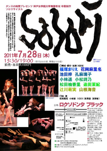 神戸女学院大学舞踊専攻第3期生の、卒業制作作品「ソロリサイタル」を一挙にお届けします。 平日ではありますが、お誘い合わせの上、多数お越しください。 日時:7月28日(木)15時半、19時 料金:1000円 会場:ロクソドンタブラック(JR環状線天王寺、地下鉄谷町線阿倍野) チケットは、出演者またはロクソドンタブラック(loxo@thekio.co.jp)へ 共催:ダンスの時間プロジェクト、ロクソドンタブラック