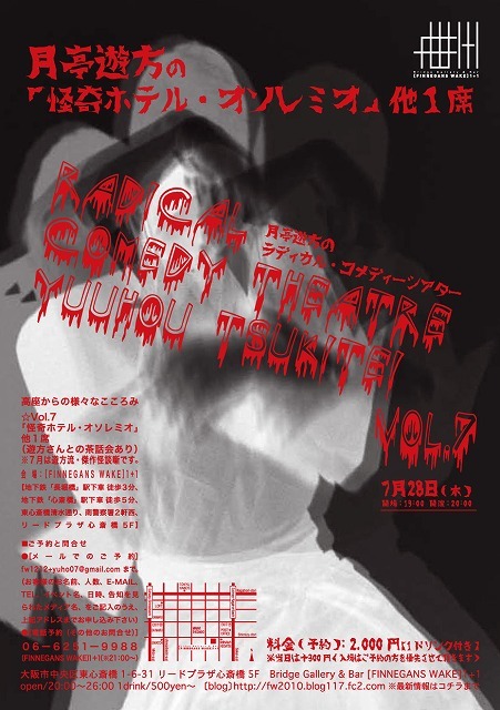 ■7/28(木)20時〜 月亭遊方のラディカルコメディーシアター vol.7 月亭遊方「怪奇ホテル・オソレミオ」他1席 (終演後 遊方さんとの茶話会あり) ※7月は遊方流・傑作怪談噺です。 →「怪奇ホテル・オソレミオ 」あらすじ いわく付きのホテルに泊まることになった主人公のマサ。 いったいどんな夜が待ちうけてるのだろうか? コミカルな遊方流怪談噺。 お時間ありましたら、 ぜひ、よろしくお願い致します。 〔日時〕7/28(木)開場:19:00 開演:20:00 〔場所〕〔FINNEGANS WAKE〕1+1 〔料金(予約)〕:2,000円【1ドリンク