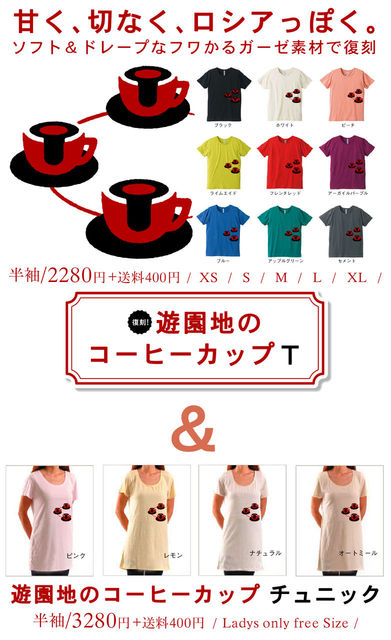 【遊園地のコーヒーカップT】復刻 受付終了いたしました、もう買えません、ごめんなさい。すみません。 2011/7/28が復刻受注生産受付終了でした〜 ---以下は復刻受注生産受付時の告知文となります--- 昨年【遊園地の記憶】というDVDの ジャケットデザインをさせてもらったご縁で 勝手にTシャツを作らせていただきました。 で、「コイツの版を処分するぞ!」との 警告が鳴り響きましたので復刻したいと思います。 【遊園地のコーヒーカップT&チュニック】 あまりにも女子チームからのリクエストが多い フワかるガーゼ素材の