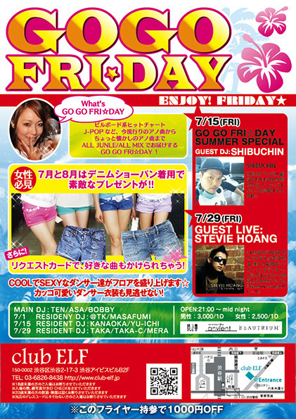 管理人様告知失礼します! 渋谷ELF(エルフ)にて、毎回爆発的な盛り上がりの大人気イベント!! ★GO GO FRIDAY★ SUMMER SPECIAL!! 金曜ELFは一番人気イベントで毎回500人以上のお客様で盛り上がっています♪ GUESTにはUK出身の『R&B界の口コミ王子』と呼ばれる、美メロ系R&Bシンガーソングライター「STEVIE HOANG」(スティーヴィーホアン)が来日ライブを敢行!! ☆STEVIE HOANG☆ ・Twitter steviehoangjp http://twitter.com/#!/steviehoangjp ・Facebook STEVIE HOANG JAPAN PAGE http://www.facebook.com/StevieHoangJP 更にシー