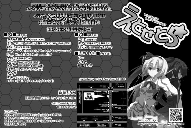 ここに参加表明でディスカウントとなります。 【東方PROJECT&VOCALOID PARTY】 えとせとらVol.7@新宿JAM VOCALOIDと東方PROJECTの、少し前の曲から最新曲まで ヒットナンバーがまんべんなく掛かる分かりやすい選曲を基本とし、 ノリノリの人から初心者まで 魅せる・踊れる・聞かせる みんなが気持ちよく思いっきり楽しめる、 参加者本位のノレるDJイベントを目指します! 新宿の空をHOTに炎上させようZE! 【日時】 7/29(金) 入場開始:24:00〜6:30 【場所】 新宿JAM http://jam.rinky.info/