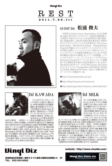 United Future Organizatuon(U.F.O.)のメンバーとして 活躍し、独立後も幅広い分野にて世界中で活動している 松浦俊夫氏をGuestに迎えてVinylDizにて Jazz,Crossoverイベントを開催します。 仙台からは、DJ Kawada,DJ MILKの経験豊富な二人と 今後のClubJazzシーンを牽引して行くであろうDJ Hiromu の三人がVinylDizをJazz,Crossover一色に染め上げます。 この機会に是非、いつもより少しお洒落をして VinylDizへ入らして下さい。 お待ちしてます。 『REST』 Open 18:00 DJ Start 19:00 FEE ¥1500(1Drink) @VinylDiz Gu