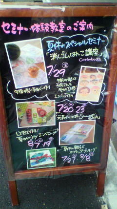 DUOの奈良三条通り店が2011年4月にオープン。 消しゴムはんこ講座 夏休みスペシャルセミナー http://www.scrap-booking.jp/duo/tempo/diary/000006.html Carimbo(カリンボ)先生が夏休みにスペシャルセミナーを開催します。 Carimbo -カリンボ- とは・・ポルトガル語で 【印鑑、はんこ】 という意味です Carimbo(カリンボ)HP http://www.carimbo.org/ Carimbo(カリンボ)ブログ http://www.carimbo.org/banana/ お子さんも参加できるセミナーです! 消しゴムはんこ講座 http://www.carimbo.o