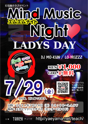 石垣島クラブイベント「エムエムナイトLadysDay」開催のお知らせ。 R&B/レゲエ/HipHop/Electro/オールジャンルでやってます。 女の子は無料で〜す ぜひお友達お誘いのうえ気軽に遊びに来てください。 お待ちしています。 【入場】MEM 1,000円 / GIRL 無料 (ドリンク別) 【日時】2011年7月29日(金) 23:00〜LAST 【場所】メガヒットパラダイス(センタービル6F) 【主催】TEACH(ティーチ) TEACH http://yaeyama.net/teach/ 沖縄/八重山/石垣島/クラブイベント/ティーチ/