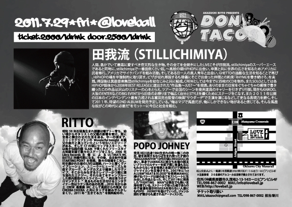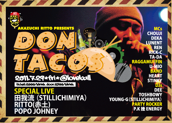 7.29(fri)@LOVE BALL那覇 AKAZUCHI RITTO PRESENTS 【DONTACOS】 ticket.2000/1drink door.2500/1drink 《SPECIAL LIVE》 田我流(STILLICHIMIYA) RITTO(赤土) POPO JOHNEY 《MC's》 CHOUJI DEKA LUNENT REN RICK-C TA-DA 《RAGGAMUFFIN》 U-MIO 《BAND》 HEART STINKY 《DJ's》 DEE TOSHBOWY YOUNG-G(STILLICHIMIYA) 《PORTY ROCKER》 P.K 挫 ENERGY