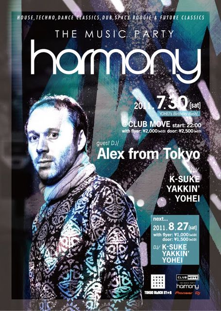 管理人様。告知失礼致します。 7/30(土)のHARMONY SPECIALは、2000年夏の初登場以来のファミリー、ALEX FROM TOKYOが約3年半振りに登場します!世界中を飛び回る彼との一夜をみんなでハッピーに過ごしましょう♪エネルギッシュ&エモーショナルなALEXのプレイにご期待ください!そして YOHEI TAKEDAのバースデーバッシュです。 7/30(土) HARMONY SPECIAL (HOUSE,TECHNO,GARAGE) PM 10 START フライヤー持参 ¥2,000(W1D) 当日 ¥2,500(W1D) GUEST DJ ALEX FROM TOKYO(NYC) DJ'S K-SUKE / YAKKIN' / YOHEI