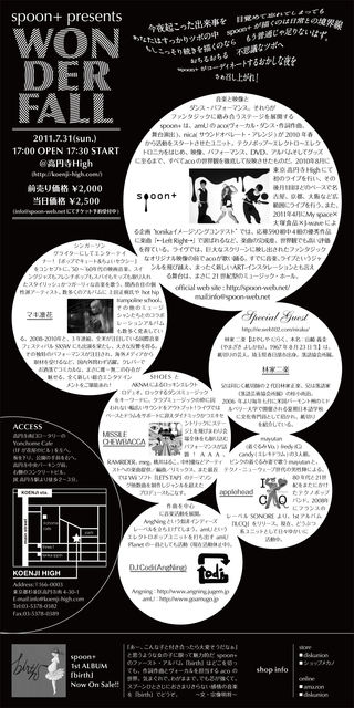 管理人様 宣伝失礼いたします。 spoon+ presents 「WONDER FALL」 at 高円寺High http://koenji-high.com/ open/17:00 start/17:30 adv/2000yen door/2500yen -Live- applehead マキ凛花 林家二楽 MISSILECHEWBACCA spoon+ -DJ- Codi(AngNing) -特典- ?来場者全員にspoon+1stALBUM「birth」発売を記念して「birth」ポスターをプレゼント! ?spoon+のメールアドレス(info@spoon-web.net)からチケット予約をしてくださった方には  予約先着50名様に、spoon+未発表曲「つぼみちゃん」を収録した