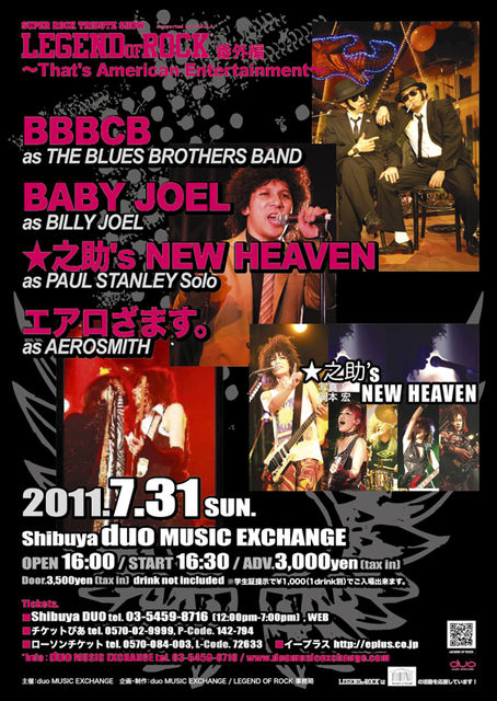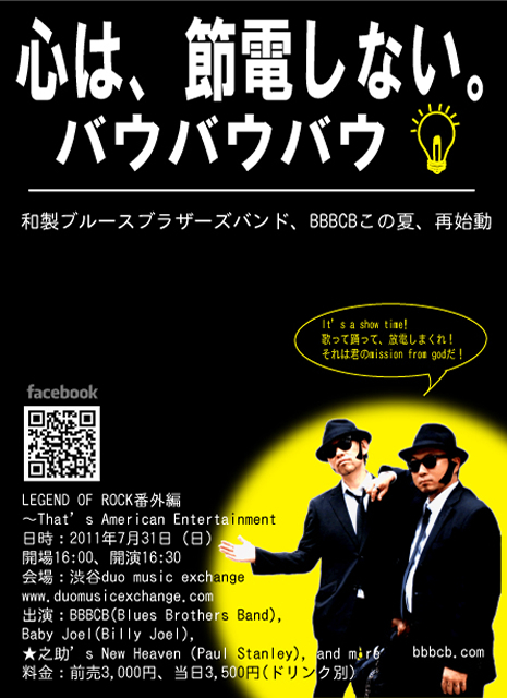 久々のライブやりますんで、告知させてください! 昨年9月を最後にアジアに逃亡したJakeTも帰ってくるのか??!! 「Legend of Rock - 番外編」に、BBBCBが参戦、トリを努めます! 日時: 2011年7月31日日曜日 場所:渋谷duo music exchange 渋谷区道玄坂2-14-8 O-EASTビル 1F 03-5459-8716 http://www.duomusicexchange.com/ OPEN 16:00 / START 16:30 料金:前売3,000・当日3,500 ドリンク別 16:30:エアロざます(Aerosmith) (45分) 17:30:★之助’S NEW HEAVEN(Paul Stanley solo) (45分) 18:30:Baby Joel