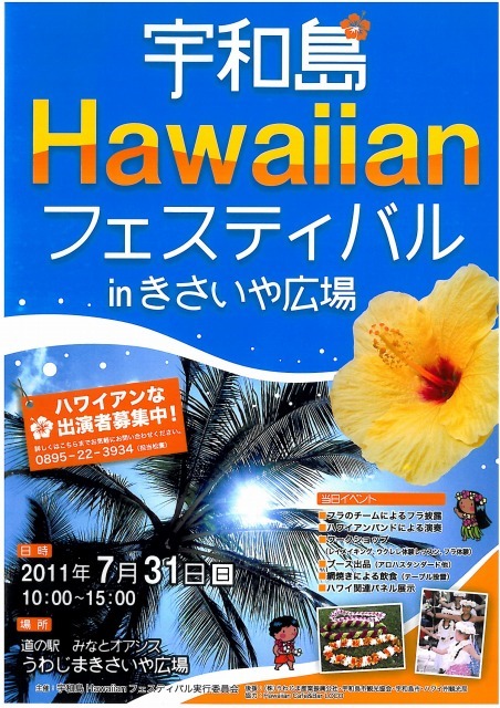 宇和島でハワイアンイベントが開催されます!! 記念すべき第一回目!! 愛媛ウクレレ部のみなさんも参加しませんか?? 出演者も募集中ということですww ■イベント名 宇和島ハワイアンフェスティバルinきさいや広場 ■開催期間・曜日 2011.7.31(日) 住所: 愛媛県宇和島市弁天町1丁目318−16 TEL :0895−22−3934 FAX:0895−22−1230 ◆イベントの詳細 フラ、ハワイアンバンド、などホノルル市と姉妹都市 である宇和島市でえひめ丸の事故から10年目の節目 に風化させない為、