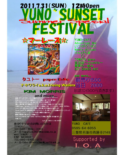 真夏です!!! 真昼間です!! 野外です! 出店です! 初の名張です! 同じく三重県やのに、通った事しかない名張。 広いな三重県。 7月31日は三重県名張に遊びに来てね〜( ̄^ ̄)ゞ ○参加アーティスト○ ・★マーレーズ☆ ・タユト-paper take ・便乱坊japonican ・ナキワライ ・KIM MORRIS @@@@@@@@@@@@@@@@@@@@@@@@@@@@@@@@@@@ 参加出店者 *yuno-cafe *advantage bar *いつびろうそく *meets-african *けんぴち家 *手ずくりひょうたん工房 音沙汰〜oto
