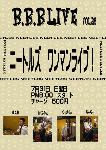 B.B.B Live Vol.26 ニートルズ ワンマンライブ! 7月31日 日曜日  PM8:00 スタート チャージ 500円