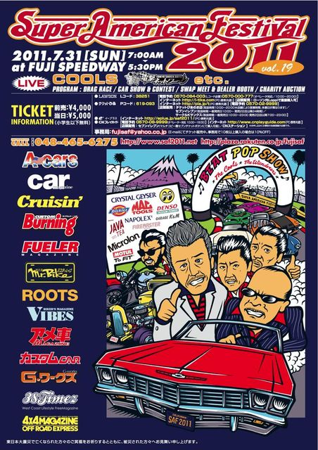 BREEZY様、この場お借りして告知させて下さい。  今年もやります。 富士スピードウェイ、夏の恒例イベント、 『スーパーアメリカンフェスティバル』20周年になりました。  #カーショー&スワップミート エントリー締め切り7月8日    http://plaza.rakuten.co.jp/fujisaf/3000  #ドラッグレ−ス    エントリー締め切り6月30日    http://plaza.rakuten.co.jp/fujisaf/14000 # スワップミート&ディーラーブース エントリー締め切り7月8日    http://plaza.rakuten.co.jp/fujisaf/4000 (カーショースペースは
