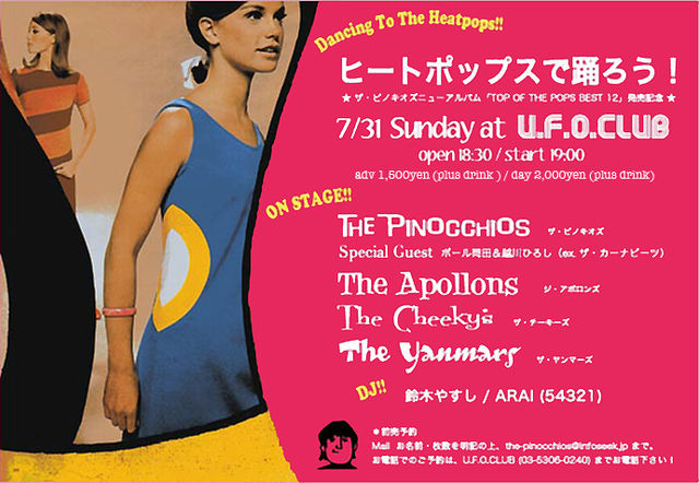 ザ・ピノキオズ「TOP OF THE POPS BEST12」発売記念 「ヒートポップスで踊ろう!」 7/31 (sun) @東高円寺U.F.O.CLUB 03-5306-0240 http://www.ufoclub.jp/ OPEN / START 18:30 / 19:00 *LIVE  ザ・ピノキオズ http://www.myspace.com/thepinocchios   ゲスト:ポール岡田&越川ひろし(ex.ザ・カーナビーツ)  ジ・アポロンズ http://ameblo.jp/theapollons  The Cheekys http://thecheekys.web.fc2.com/  ザ・ヤンマーズ http://www.myspace.com/theyanmars *DJ  鈴木やすし and More ADV ¥1,500 / DAY ¥