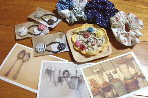 お久しぶりです♪ 最近、急に蒸し暑く なってきましたが みなさん、 体調いかがですか?* そろそろ★恒例のイベント★ 開催しようと思います◎ 今回も素敵なset ご用意いたしました:) 内容ゎ..* *)シュシュ 1ヶ *)くるみボタンのゴム 1ヶ *)カボション ヘアピン 2ヶ *)カボション 指輪 1ヶ *)ポストカード 1枚 これからの 梅雨、暑さ対策などに もってこいなモノばかり♪ 新登場したカボションシリーズゎ 委託先でも大