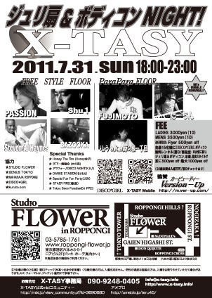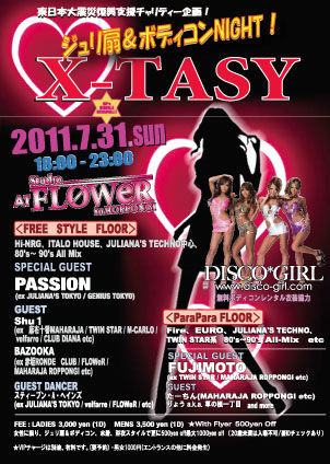 <X-TASY 東日本大震災復興支援チャリティー企画> 【7/31(日)ジュリ扇&ボディコンNIGHT!@X-TASY】 X-TASYは、ジュリアナ東京復活祈願イベントです。 今回もメインフロアは、お立ち台バトルがコンンセプトのフリースタイル中心で、サブフロアは、パラパラ専用フロアの、2フロアで開催します。 メインフロアでは、元ジュリアナ東京のオリジナルメンバーである、DJ PASSIONと、パフォーマーのスティーブンが、当時を再現してバブル時代にタイムスリップ! 今回もDISCO*GIRLがSEXYボディコンを無料レンタル協力で、ダンスフロア