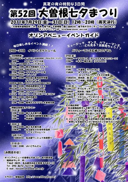今年もこの季節がやって来ました。 今回も3年連続、言葉ズーカでパフォーマンス広場に出演します。 (最終日7/31(日)の夕方−夜の出演です。) ■7/31(日)17:00−19:10※お祭り自体は7/29(金)−7/31(日)12:00−20:00です。 『第52回大曽根七夕祭り』 @北区/大曽根「オゾンアベニュー」内パフォーマンス広場(「焼肉はやしや」さんと「井上園芸」さんの向かい) 出演:ISAMU/izumi/じゅんこ/ChangmiUNIT(Changmi&ユータ(exTui)&平尾義之(深響)&Yasming)/松井アミ/ヒロ/はらだよしひろ/小島哲也(ASTRAW-BOUND'S)※追加決定! 他にも