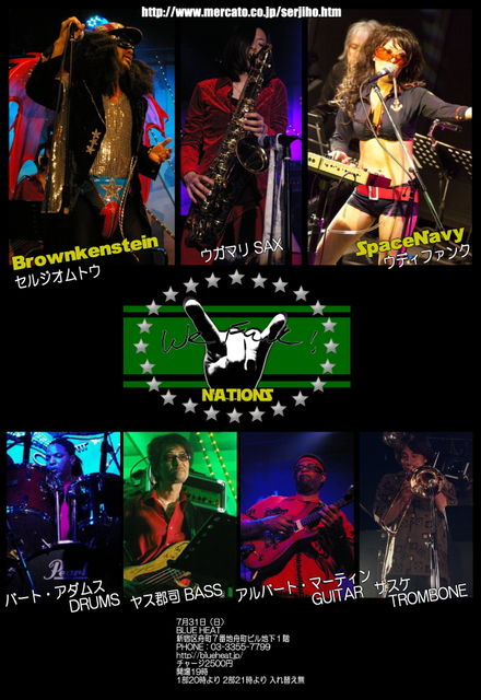 WeFunk! 7月31日(日) BLUE HEAT 新宿区舟町7番地舟町ビル地下1階 PHONE:03-3355-7799 http://blueheat.jp/ チャージ2500円 開場19時 1部20時より 2部21時より 入れ替え無 -WFN- セルジオムトウ(Vo) WODDYFUNK(Vo&Talkbox) 郡司康男(Bs) バート・アダムス(Dr) アルバート・マーティン(Gt) ウガマリ(Sax) サスケ(Tb)
