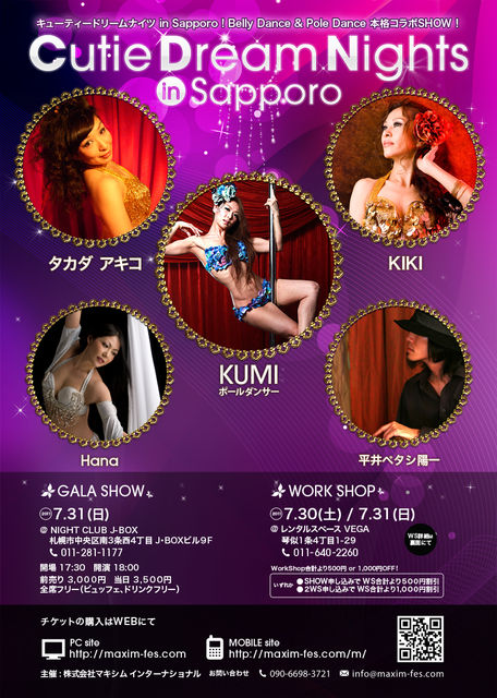 おお! アキコさん、2/5〜6i以来! http://mixi.jp/view_event.pl?id=59635046&comm_id=840074 の北海道Liveです! Hanaさん企画のスペシャルイベント♪ アキコさん単独公演ではありませんが、 多くの素敵なダンサーとパーカッションのペタシさんが参加されます! (ワークショップは2お日間に渡って行われます) ---------------------------------- 『CUTIE DREAM NIGHTS in Sapporo』 (株)マキシムインターナショナル主催 ◆7/31(日) 出演メンバー KUMI/タカダアキコ/KIKI/Hana/平井ペタシ陽一 開場17:30 開演18:00 場所