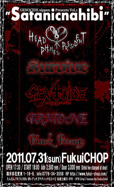 7月31日(日) 福井 CHOP GENOCIDE nippon Presents "Satanicnahibi" Vol.1 「サタニックな日々」 スペシャルイベント OPEN17:00 / START17:30 前売り¥2,500 当日¥3,000 (1drink order) Act : SURVIVE / HEAD PHONES PRESIDENT / TRITONE / BLCK BUNNY / GENOCIDE nippon 福井市花堂東1-18-6. TEL,0776-34-3558. http://www.fukui-chop.com/ 前売りチケット予約受け付けております。 geno666@wt.ttn.ne.jp http://www2.ttn.ne.jp/~geno/Untitled-2.htm