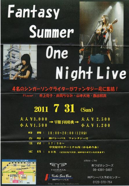 □『Fantasy Summer Night Live』 日時:2011年7月31日(日) 場所:神戸シーバス ファンタジー号 料金:前売2500円・当日3000円(小人前売1200円・当日1500円) 時間:17:30〜受付開始(中突堤中央ターミナル内) 定員:80名 出演者:岸岡ちなみ・井上苑子・山本大地・西出和真 ※取り置きフォーム・メール並びにライブ会場等で直接ご購入して頂いた方の中から 今回は特別に抽選で5名様に『岸岡ちなみ直筆サイン入りクオカード(500円相当)』をプレゼント致します。 取り置きフォームはこちら http://my.