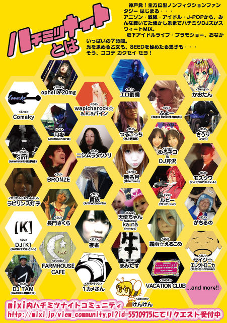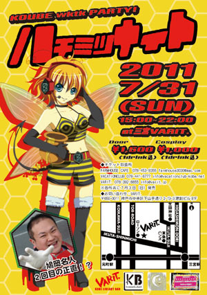2011/07/31(SUN) at 三宮VARIT. 「ハチミツナイト 2nd公演」 ○OPEN/START 15:00 CLOSE 22:00 ○入場料 \1500(1D付き) ※コス割>>>入場料金¥500引き <DJズ> DJ [K] (GARDEN / デスコテックナイト) DJ TAM(GARDEN / 歌謡曲ナイト) さうり (pupil) DJ BRONZE DJ 月夜 (AnimeConcerto) DJ.貴族 (AnimeConcerto) エロ劉備 つるこっち (東方夢魂劇) モスクワ (ハイドラGP / D.I.V.A.) ニシムラタツノリ wapicharock☆a.k.aパイン がちるの 長門さくら