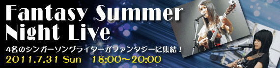 □『Fantasy Summer One Night Live』 日時:2011年7月31日(日) 場所:神戸シーバス ファンタジー号 料金:前売2500円・当日3000円(小人前売1200円・当日1500円) 時間:17:30〜受付開始(中突堤中央ターミナル内) 定員:80名 チケット予約:ライブ時手売用チケット購入もしくは神戸シーバス予約センター(0120-370-764)にて!! http://www.kobe-seabus.com/event.html